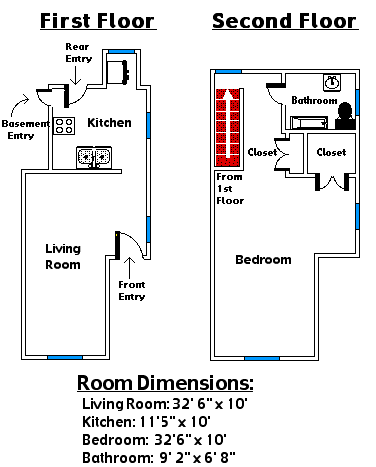 This 1 bedroom encompasses two enormous floors and is almost unbelievable. It is a very large apartment with a nice living room, and an extra large bedroom with 2 closets. Big enough for 2 people to share! Off street parking and laundry. Close to colleges and on bus route. Click on Pictures to enlarge! |