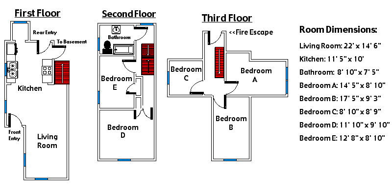 This newly renovated 5 bedroom apartment encompasses 3 floors and plenty of space for everyone. The remodeled kitchen has new stainless steel appliances, granite countetops, and new cabinets. The kitchen and living room have an open layout with hardwood floors throughout. The 5 bedrooms and modern bathroom are on the 2nd and 3rd floor of the house. It has off street parking, a washer/dryer, and a back yard. It's close to both colleges, and a short walk down to the Center St./Church St. bus stop. Click on Pictures to enlarge! |